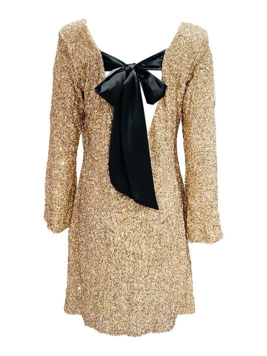Abito Corto Paillettes Oro Rosa con Fiocco Nero