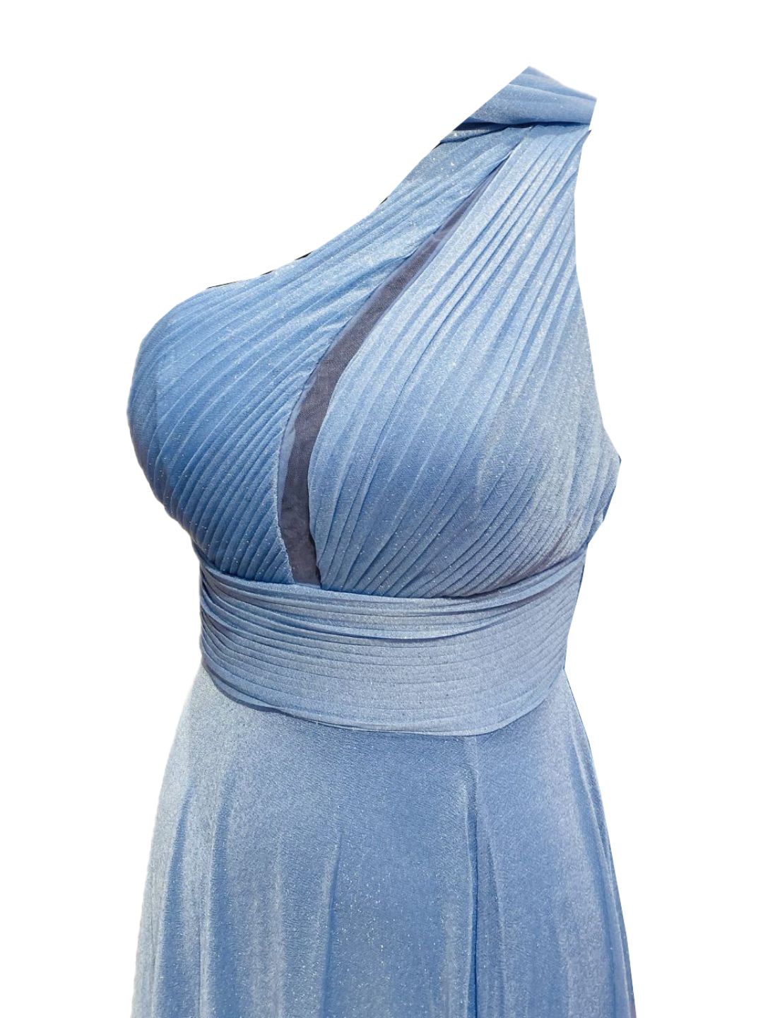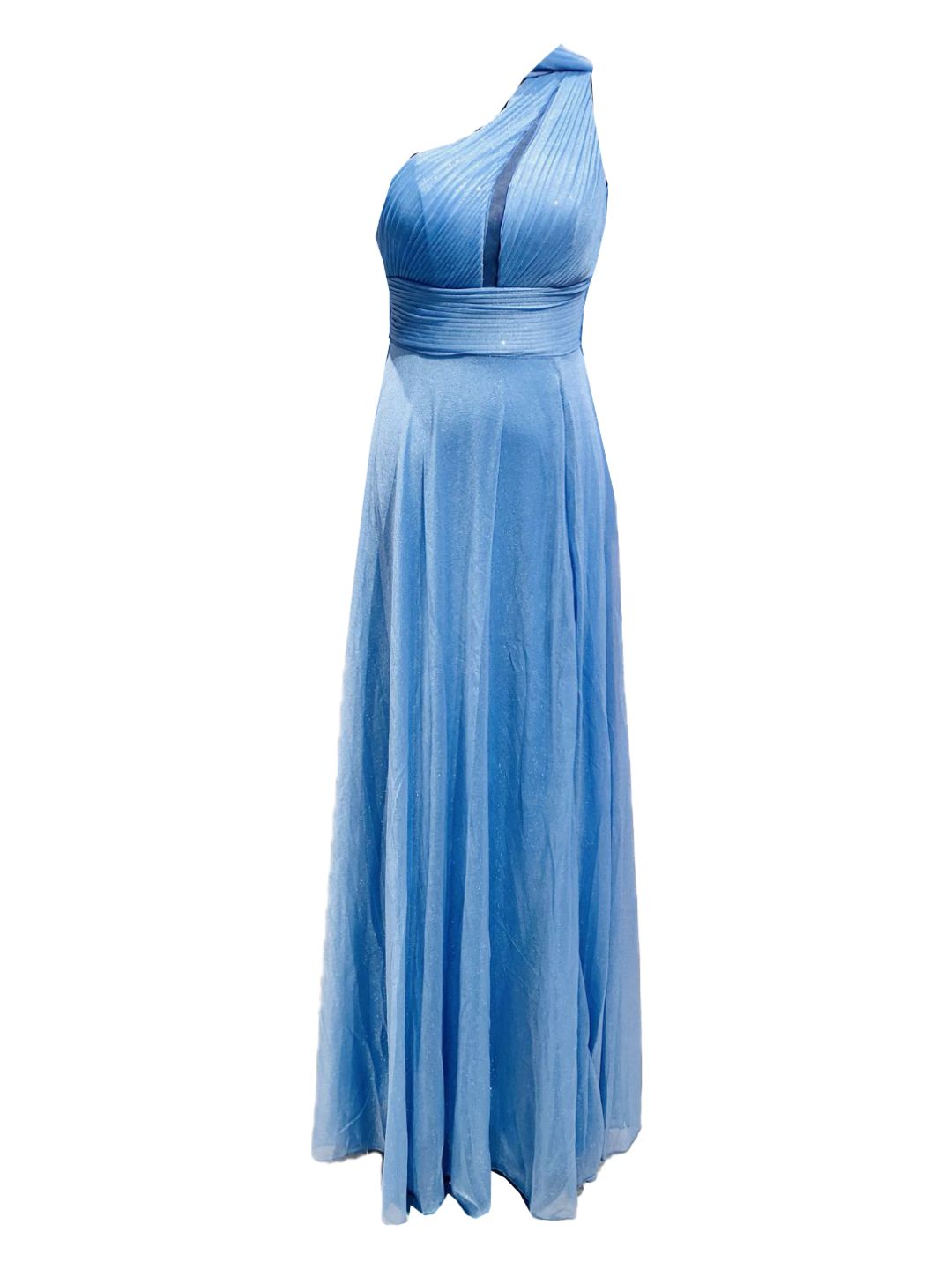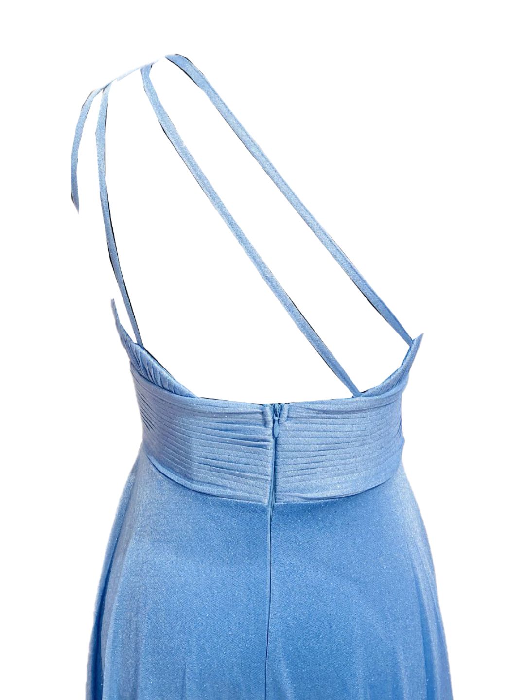 Questo abito da cerimonia monospalla è l'emblema dell'eleganza moderna 💙. Realizzato in tessuto di alta qualità, presenta un design asimmetrico con una singola spallina che dona un tocco sofisticato e contemporaneo, perfetto per chi desidera distinguersi con stile.