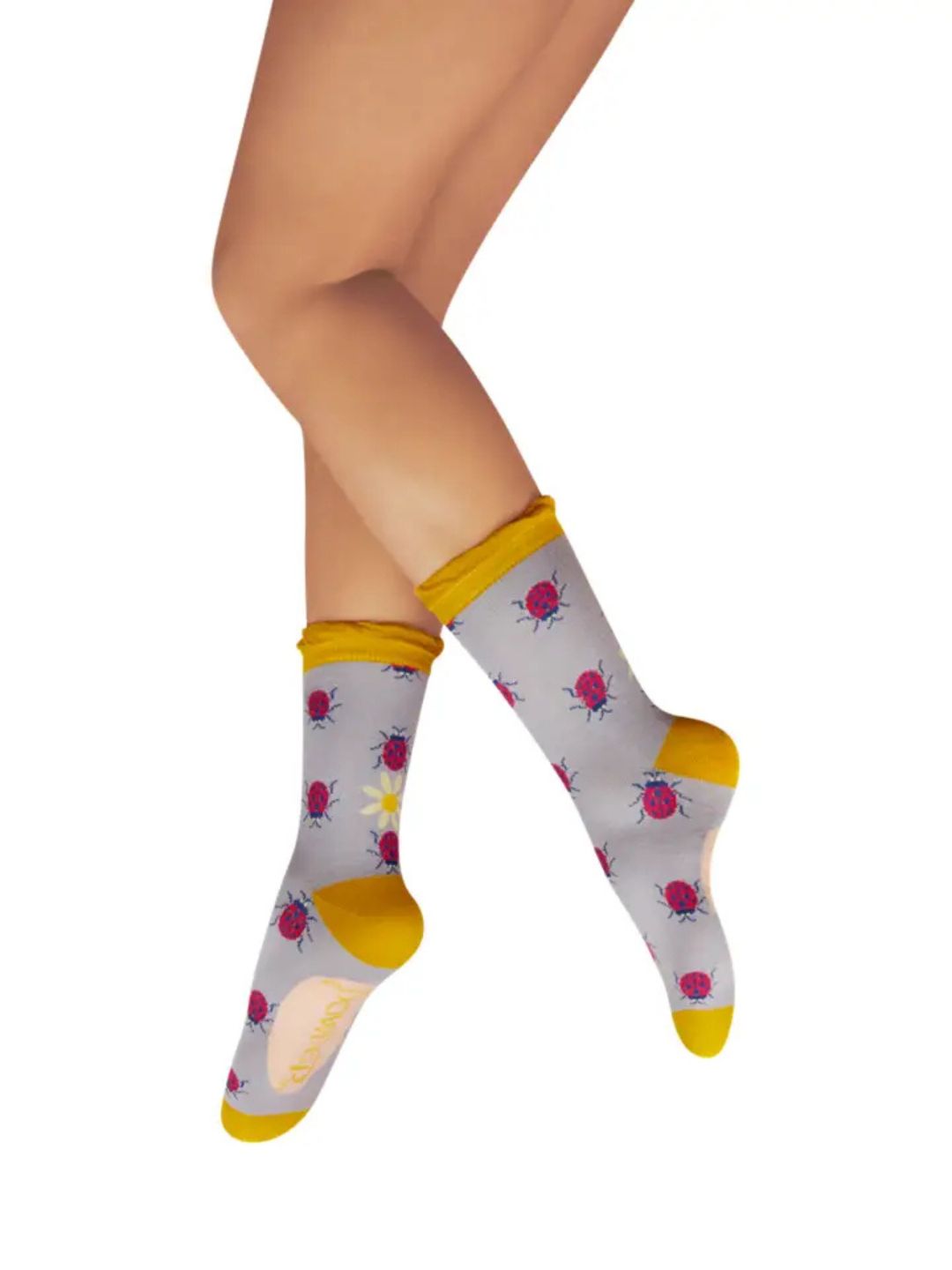 Aggiungi un tocco di dolcezza alle tue giornate con i calzini alla caviglia Powder Design Coccinelle Adorabili Lilla! Il motivo con piccole coccinelle su uno sfondo lilla porta un dettaglio giocoso e femminile ai tuoi outfit quotidiani 💜.