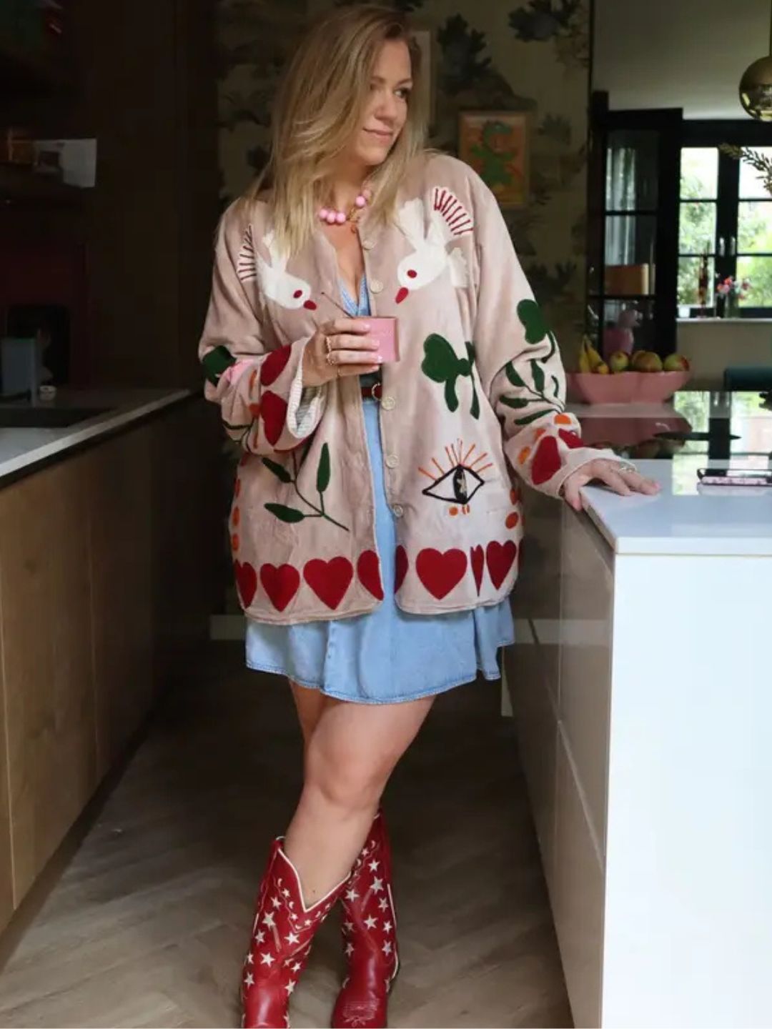Versatile e colorata, può essere indossata in modo casual con jeans e t-shirt, oppure abbinata a un abito elegante per un look sofisticato e originale. La vestibilità è comoda e adatta fino alla taglia 46, rendendola un capo inclusivo e di carattere.