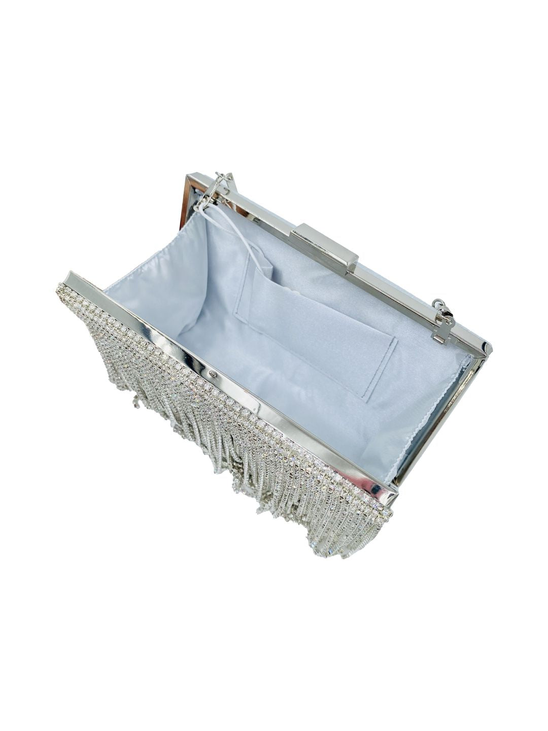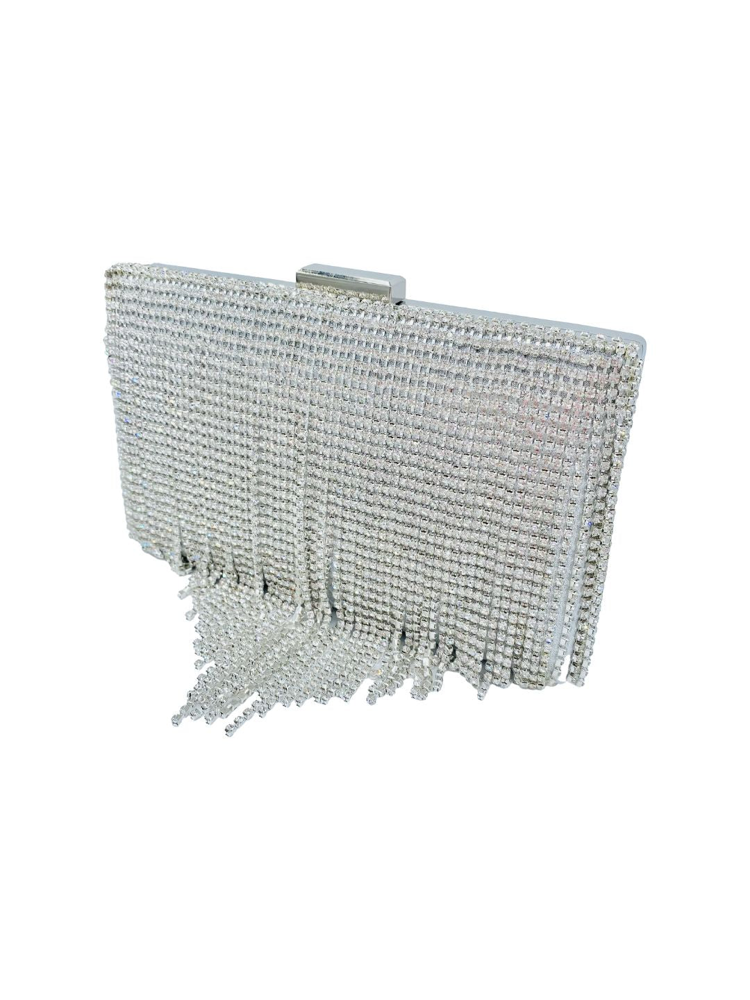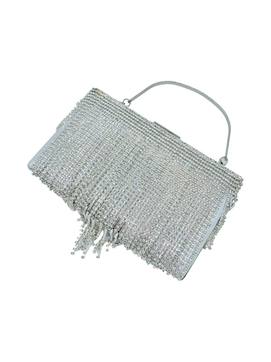 Brilla senza limiti con la nostra Pochette Clutch Argento con Frange e Strass, l’accessorio statement per le tue serate più glam ✨