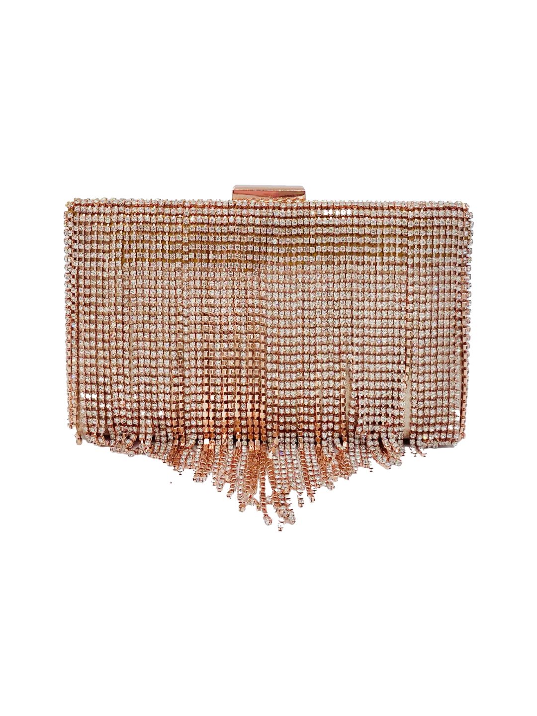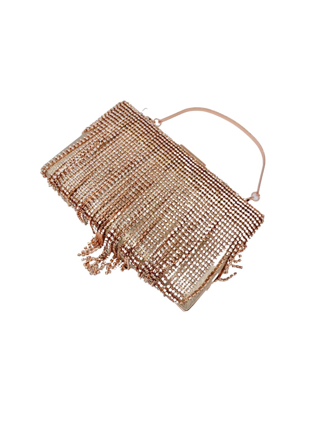 🌸 POCHETTE CLUTCH RETTANGOLARE CON FRANGE E STRASS – ORO ROSA ✨